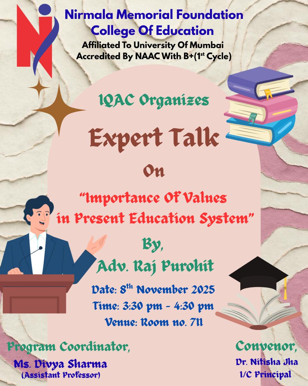 SPORTS DAY 1ANNUAL DAY AND FAREWELL DIWALI GURU POORNIMAHINDI DIWAS EXPERT TALK ON POSITIVE THINKING GALLERY WALKHEARTFUL SESSION Orientation of F.Y.B.EdREPUBLIC DAYSCIENCE DAYTEACHERS DAYMARATHI DIWASMAKARSANKRANTIJANMASHTAMIJOY OF GIVINGINDOOR SPORTS DAYINSTRUCTIONAL MATERIAL WORKSHOPINTERNATIONAL YOGA DAYWOMEN'S DAY INTRODUCTION TO MICRO TEACHINGINDEPENDENCE DAY DEMO LECTURE SKILLS PRESENTATION BY SENIORS CHRISTMAS CELEBRATION(DEC- 2023)ANNUAL DAY (JAN-2024)STUDENT COUNCIL ELECTION 2024MAKAR SANKARANTI JAN -2024 BLOOD DONATION CAMP JAN 2024 COMMUNITY WORK (JAN -2024)WEBINAR IPR (INTELLECTUAL PROPERTY RIGHTS) (FEB-2024)KALA GHODA VISIT (JAN-2024)HEARTFULNESS EDUCATION PROGRAM (JAN-2024)REPUBLIC DAY CELEBRATION (JAN-2024)PERSONALITY DEVELOPMENT (JAN-2024)REUSME MAKING WORKSHOP (FEB-2024)TRICKS TO CRACK INTERVIEW (FEB-2024)INVESTMENT AWARENESS PROGAM (FEB-2024)MARATHI DIWAS (FEB-2024)NATIONAL PARK VISIT (FEB-2024)EDUCATIONAL VISIT TO NEHRU SCIENCE CENTER (SCIENCE DAY) (FEB-2024)EXPERT TALK CERVICAL CANCER (MARCH-24)PICNIC (MAR-2024)CAMPUS PLACEMENT (MAR-2024)COMMUNITY WORK (APR-2014)COMMUNITY WORK (APR-2024)FAREWELL PARY -JULY 2024GURUPOORNIMA CELEBRATION (JULY -2024)FELICITATIN OF TOPPERS (AUG-2024)EXPERT TALK ON CYBER SECURITY (13th SEPT, 2024)TEACHERS' DAY AND HINDI DIWAS (14THSEP-2024)WORLD NATURE DAY (3rd OCT,2024)MANI BHAWAN VISIT ,GANDHI SANGHRALYA (5TH OCT,2024)INSRTUCTIONAL MATERIAL WORKSHOP CONDUCTED BY BAHVYA CHHEDA(3RD AUG-2024))STUDENT ORIENTATION PROGRAM (7TH OCT- 2024)VACHAN PRERNA DIWAS (15TH OCT, 2024)NATIONAL LEVEL QUIZ,INSPRING MINDS (15TH OCT,2024)HEARTFELNESS PROGRAM (2023-24)DIWALI CELEBRATION ( 25TH OCT-2024)TALENT HUNT (29th NOV -2024)WORKSHOP ON CTET EXAMINATION (7TH DEC 2024)HEARTFULNESS EDUCATION PROGRAM (DEC-2024)MEDITATION DAY (21ST DEC, 2024)EXPERT TALK (14TH DEC,2024)ICT TOOL WORKSHOP (21ST DEC 2024)CHRISTMAS CELEBRATION (24DEC 2024)MAKAR SANKRANTI (16 JAN 2025)MASOOM FOUNDATION (18JAN 2025)REPUBLIC DAY CELEBRATION(25JAN 2025)COMMUNITY WORK (20JAN-2025)JOY OF GIVING (JAN 2025)LECTURE SERIES 1&2 (1ST FEB,2025)BASANT PANCHAMI (3RD FEB2025)LECTURE SERIES 2 (Collaboration with Oriental)(8-FEB-25)PLACEMENT DRIVE(THAKUR RAMANARAYAN SCHOOL) (22 FEB 2025)RESUME-MAKING WORKSHOP (8TH MARCH- 25)COMMUNITY WORK (24 FEB-1ST MARCH 25)TIP TO CRACK INTERVIEW (8 MARCH-2025)CAMPUS DRIVE (15TH MAR-2025)FINANCIAL LITERARCY(28THOCT-2025)GUDI PADWA & MARATHI CELEBRATION (29TH OCT- 2025)ART AND CRAFT WORKSHOP (4TH APRIL- 2025)STRESS MANAGEMENT (21ST APR-2025)IPR AWARENESS PROGRAM (8TH MAY-2025)NATIONAL READING DAY (30TH JUNE-2025)ENVIRONMENT DAY (30THJUNE-2025)GURU POORNIMA (12th JULY -2025)ALUMNI DEMO LESSON (12th Aug 2025)INDEPENDENCE DAY AND JANMASHTAMI (14TH AUG-2025)TEACHING AID WORKSHOP (14AUG-2025)TEACHER'S DAY (4 SEP-2025)HINDI DIWAS (13 SEP -2025)GARBA COMPETION (RAS-RANGILO)(27SEP-2025)GANDHI JAYANTI (4OCT-2025)INDUCTION PROGRAM (6TH OCT-25)OVERCOMING PROCASTINATION(7TH OCT-2025)INTERNATION CONFERENCE (8TH OCT- 2025)VACHAN PRERNA DIWAS (11TH OCT -2025)DIWALI CELEBRATION (14TH OCT-15TH COT 2025)EXPERT TALK (VALUE-EDUCATION)(8TH NOV-2025)